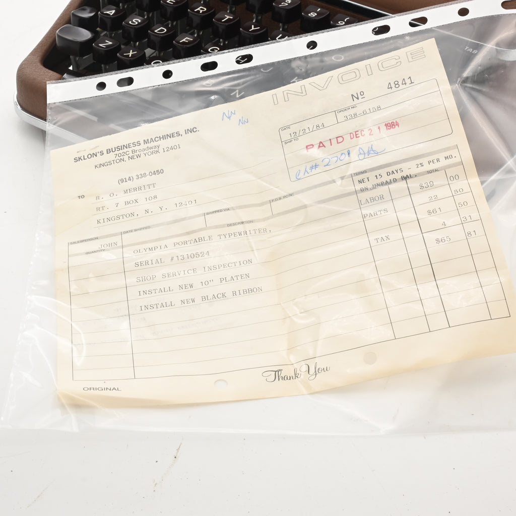 Bonus: an original service invoice from 1984 and related vintage ephemera accompany the typewriter—offering a unique glimpse into its history.
